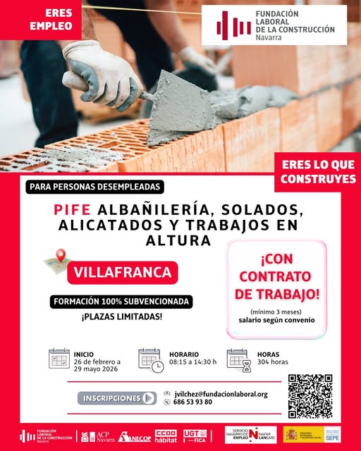 Te informamos del inicio del “PIFE: Albañilería, solados, alicatados y trabajos en altura”, dirigido a personas desempleadas que quieran incorporarse al mercado laboral en un sector con alta demanda de profesionales.